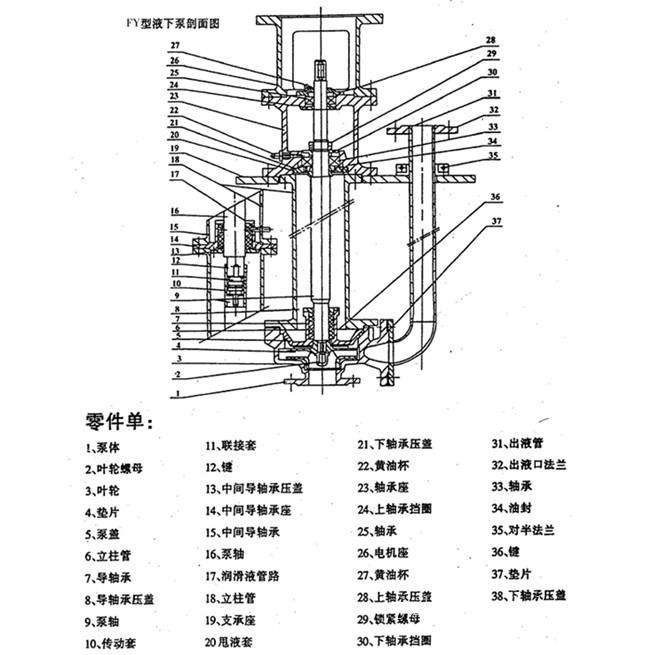 FY型主要由泵體、泵蓋、葉輪、軸、彈性聯(lián)軸器、管法蘭、導(dǎo)軸承、中間接管、上下出液管、軸承架、底板等零件組成。